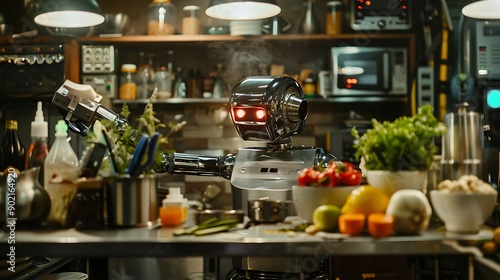 Automated kitchen with a sophisticated robot cooking traditional Indonesian cuisine using fresh spices and ingredients