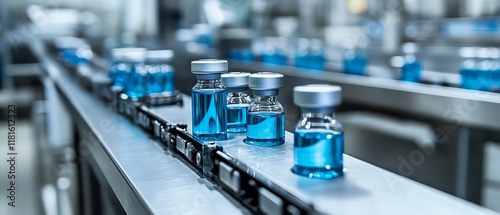Automated pharmaceutical production line in a hightech laboratory, featuring syringes and vials moving along the assembly line with precision and efficiency