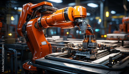 Automated robotic arm welds metal in futuristic manufacturing industry generated by AI