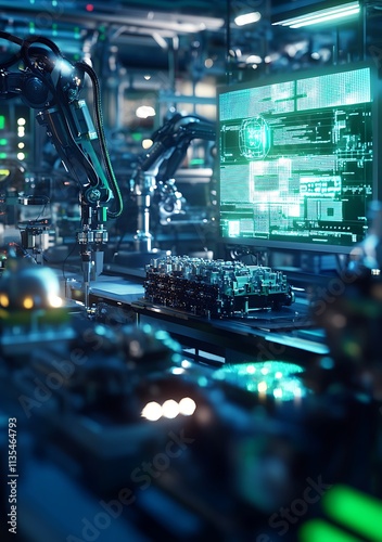 robot, robotic, automation, assembly, line, factory, manufacturing, industry, technology, production, machine, machinery, futuristic, modern, advanced, digital, computer, screen, monitor, control, process, engineering, innovation, efficiency, progress, future, industrial, system, automated, smart, high technology, equipment, electronic, circuit, component, part, detail, precision, workflow, operation, workspace, blue, dark, lighting, night, clean, sterile, metallic, metal