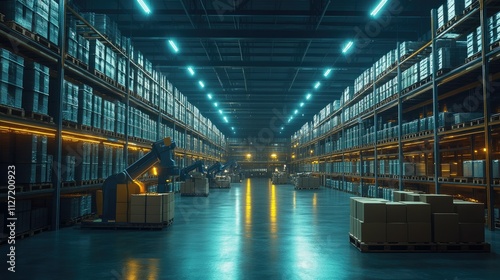 warehouse, robot, robotic, automation, industry, factory, technology, manufacturing, logistic, distribution, supply, chain, storage, inventory, shelf, rack, box, package, carton, container, aisle, floor, light, lighting, blue, neon, modern, futuristic, efficient, production, transport, machinery, equipment, process, digital, system, smart, innovation, work, space, building, interior, scene, night, dark, metallic, steel, pallet, good