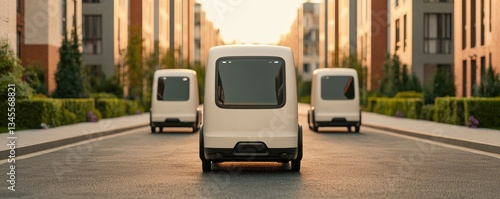 Autonomous delivery vehicles on urban streets cityscape digital image evening light futuristic concept