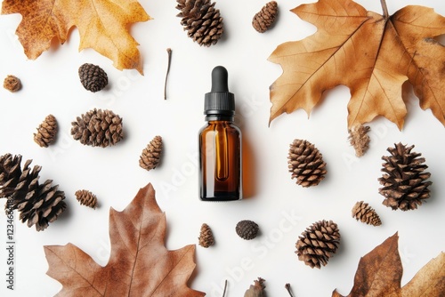 autumn, aromatherapy, essential oil, dropper, leaf, fall, pine cone, natural, rustic, seasonal, healing, wellness, spa, relaxation, organic, nature, holistic, calming, tranquil, serene, beauty, skincare, herbal, alternative medicine, therapeutic, foliage, earthy, cosy, fresh, botany, health, rejuvenation, peaceful, environment, balance, decoration, stylish, minimalistic, elegant, simplicity, clean, white background, texture, design, arrangement, harmony, calmness