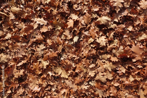 autumn background of fallen leaves on the ground. Background of dry autumn brown leaves