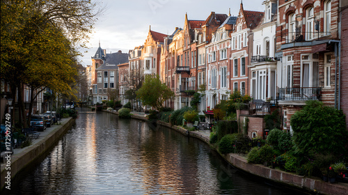 Autumn canal lined with historic Dutch houses and golden trees reflecting in the water