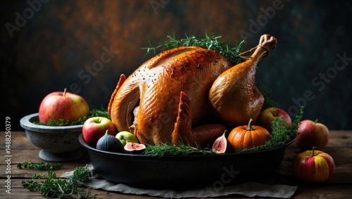 Autumn celebration showcasing a whole roasted turkey accompanied by apples, pumpkins, figs, and herbs on a festive dining table.