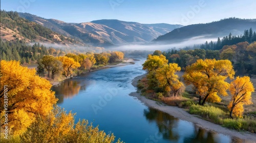 idaho, autumn, fall, foliage, leaf, tree, river, vale, landscape, scenic, nature, colourful, gold, yellow, orange, water, mist, fog, morning, sunlight, mountain, hill, forest, wilderness, outdoors, travel, tour tourism, destination, season, beauty, vibrant, peaceful, serene, tranquil, picturesque, aerial view, drone, copy space