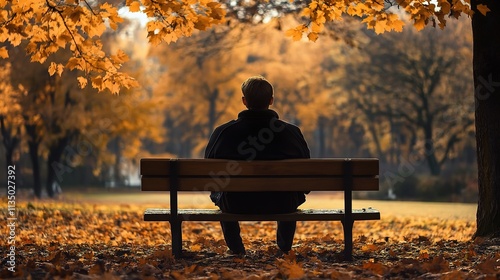 Autumn Contemplation: A solitary figure sits on a park bench, enveloped by the warm hues of an autumnal landscape. The image evokes a sense of peace and reflection.