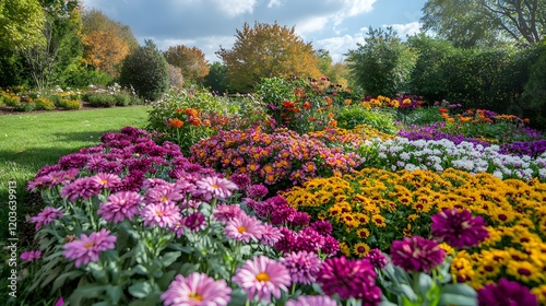 autumn, garden, flower, blooming, colourful, vibrant, pink, purple, yellow, orange, red, white, chrysanthemum, zinnia, sunflower, daisy, flower petals, blossom, plant, foliage, greenery, landscape, nature, outdoors, scenic, beauty, bright, sunny, day, season, fall, flora, botanical, bloom, growth, summer, meadow, sunlight, bush, tree, leaf