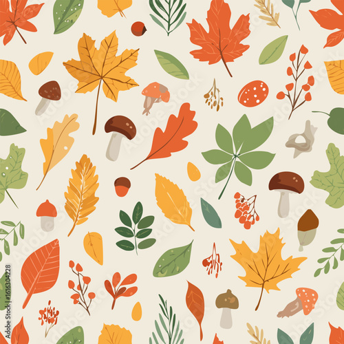 autumn, fall, vector, seamless, pattern, leaf, foliage, leaf, berry, mushroom, oak, maple, chestnut, acorn, red, orange, yellow, green, brown, beige, background, cartoon, flat, design, nature, seasonal, wrapping, textile, fabric, wallpaper, botanical, thanksgiving, harvest, fall season, cosy, cute, decorative, ornament, repeat, children, forest, timberland, natural, wild, plant, flora, doodle, drawn