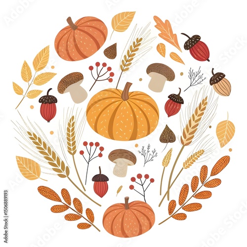 Autumn Harvest Circle in Nordic Folk Design, nordic harvest design, folk autumn symbols, symmetrical scandi wreath, seasonal flat art, rustic foliage icons, awe, surreal, elegance, majestic, ethereal