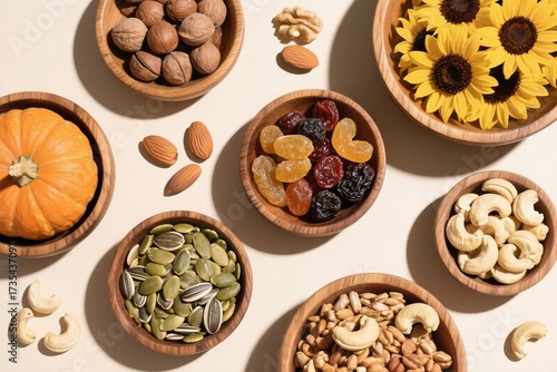 Autumn Harvest Display with Nuts, Dried Fruits, Pumpkin, and Sunflowers