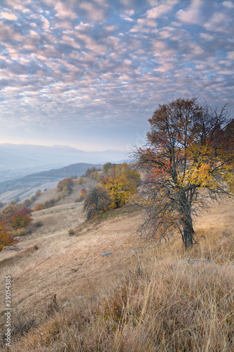 transylvania, rural, provincial, hill, tree, autumn, colours, grass, landscape, panorama, gritty, pebbly, scenic, natural, protect, land, abandoned, lean, dry, wizen, leaf, head, cold, scenery, colourful, red, yellow, orange, trunk, bush, green, foliage, leafy, loft, shroud, old, callow, peeled, sky, cloud