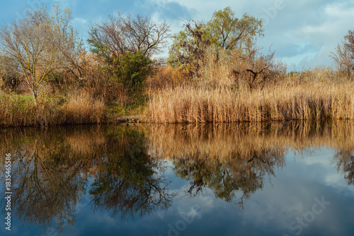 serene, lake, autumn, foliage, mirrored, water, tall, grass, tree, creating, peaceful, atmosphere, nature, landscape, environment, calmness, beauty, seasonal, colours, calm, scenic, flora, ecosystem, wildlife, sky, cloud, sunlight, harmony, picturesque, vibrant, stillness, scenery, botanical, rural, idylli, relaxation, exploration, adventure, freshness, wilderness, ecology