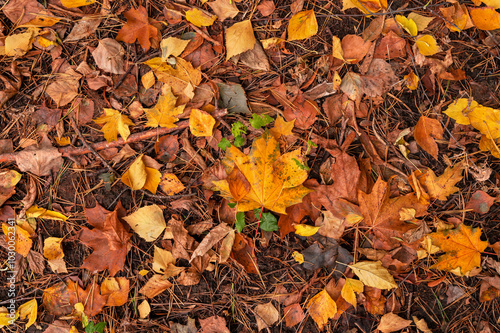 Autumn leaf nature texture. Fall tree leaves and grass. Red, yellow and orange color foliage pattern. Top view autumnal backdrop.