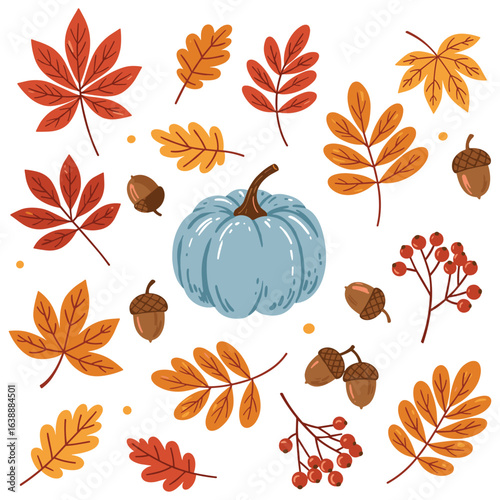 Autumn leaves and blue pumpkin with acorns and berries – stock vector flat illustration