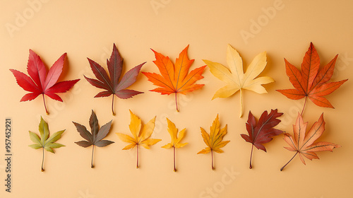 autumn leaves, like maple and oak, in various shades of orange, red, and yellow against an isolated ecru background