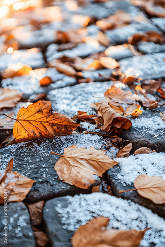 Autumn leaves nestled in cobblestones with a soft layer of first snow—capturing the poetic transition between seasons in warm golden hour light.