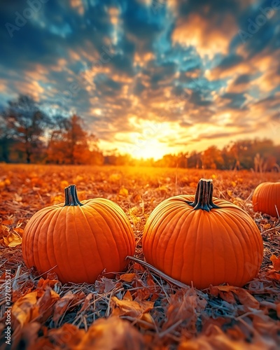 Autumn pumpkins sunset field scene