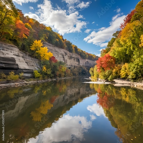 autumn, fall, foliage, leaf, tree, river, water, sky, cloud, colourful, vibrant, landscape, nature, scenic, tranquil, peaceful, serene, calm, cliff, rock, gorge, sunlight, season, october, november, yellow, orange, red, green