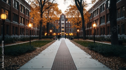 Autumn scene at a university campus with a pathway, lampposts, and brick buildings lined with trees featuring fall foliage.