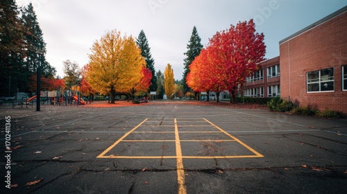 Autumn Schoolyard with Colorful Trees and Asphalt Playground, Representing Education, Community, and Seasonal Change