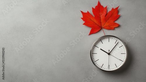 Autumn Time: A Red Maple Leaf and Clock on Grey Background