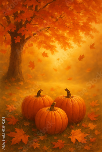Autumn tree with falling orange maple leaves and three pumpkins on grass in a warm fall light, happy thanksgiving day