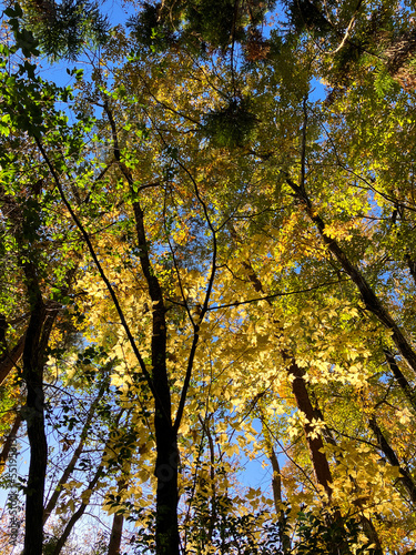 autumn trees with yellow and light green leaves in the forest