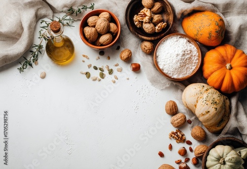 autumn, baking, ingredient, nut, pumpkin, flour, bread, oil, spice, healthy, food, cooking, receipe, natural, organic, seasonal, thanksgiving, harvest, fall, display, rustic, tabletop, bowl, pottery, clothes, textile, wholesome, epicure, kitchen, preparation, arrangement, decor, autumn, gourmet food, fresh produce, autumn color, healthy eating, fresh