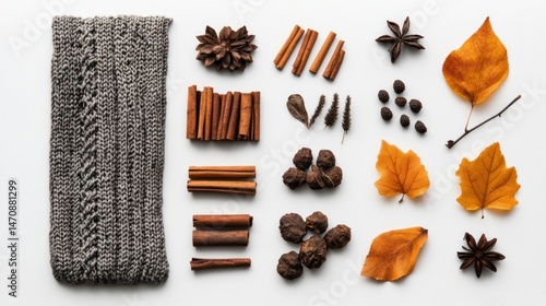 autumn, collection, natural, element, spice, cinnamon, dried, leaf, pine, cone, grey, knit up, fabric, arrangement, object, texture, brown, orange, dark, light, design, background, flat, pattern, decor, fall, item, craft, winter, detail, surface, white, space, warm, brownish, decorative, composition, display, textured, cosy, seasonal