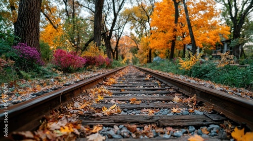 Autumnal railway path through colorful trees