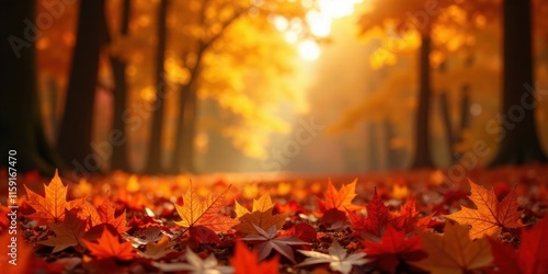 Autumnal Serenity Golden Sunlight Filtering Through a Canopy of Trees, Illuminating a Carpet of Fallen Leaves on the Forest Floor