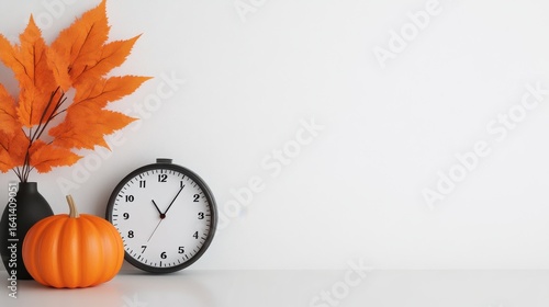 Autumnal Still Life Orange Pumpkin, Clock, and Leaves on White Background