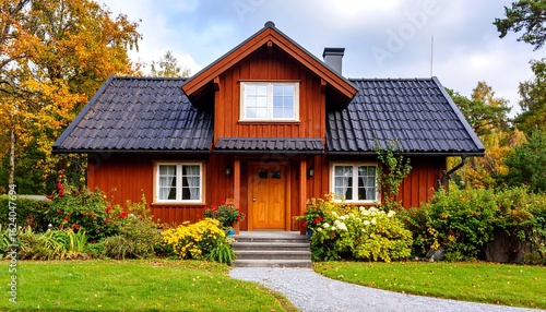 house, autumn, fall, wooden, red, home, garden, tree, foliage, colourful, landscape, nature, exterior, front, cosy, charming, bungalow, scenery, landscaping, flower, plant, grass, path, step, window, door, roof, dark, blue, grey, sky, cloud, beauty, peaceful, rustic