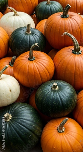 pumpkin, orange, green, white, harvest, vegetable, gourd, crop, farm, agriculture, stack, pile, many, multiple, abundant, colourful, vibrant, ripe, healthy, nature, food, produce, background, texture, seasonal, october