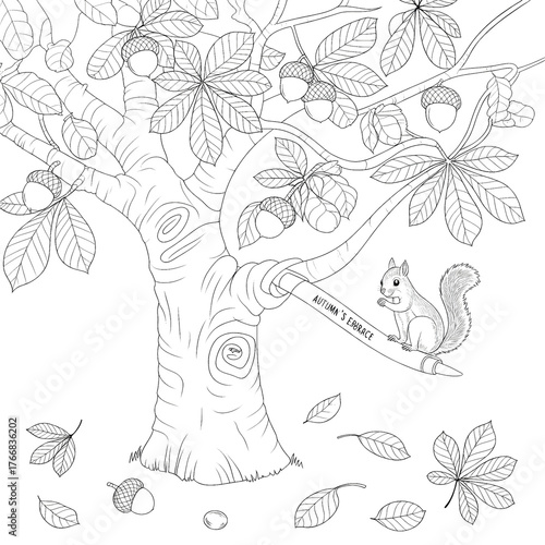 Autumn's Embrace A Detailed Tree Illustration with Squirrel and Falling Leaves for Coloring and Creativity