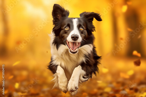 border collie, dog, jumping, autumn, leaf, happy, energetic, playful, pet, animal, canino, joyful, excitement, motion, action, fluffy, teeth, yellow background, forest, seasonal, agility, mid-air, running, exercise, fetch, nature, park, mammal, sharpened, dynamic, alert, paw, companion, loyal, training, watching, sunny day, recreation, purebred dog