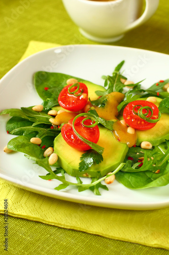 avocado, dressing, salad, food, arugula, tomatoes, rocket, lettuce, mustard, pine nut, sauce, nobody, freshness, leaf, epicure, lunch