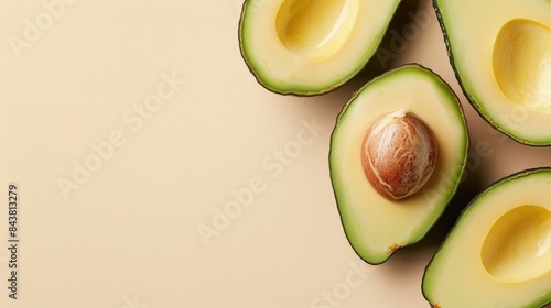 Avocado shell hollowed out half avocado with space on beige backdrop Fresh ingredient cut into slices