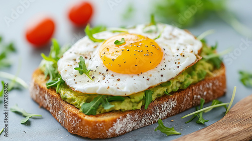 Avocado Toast with Fried Egg: A classic breakfast or brunch staple, featuring a perfectly toasted slice of bread topped with creamy avocado, a sunny-side-up fried egg, and fresh arugula.