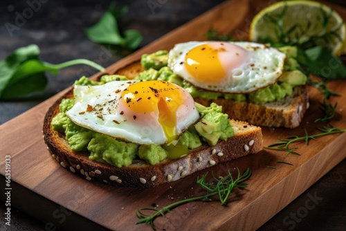 Avocado toast with fried eggs, seasoned with rosemary and pepper, on a wooden board. Generative AI.