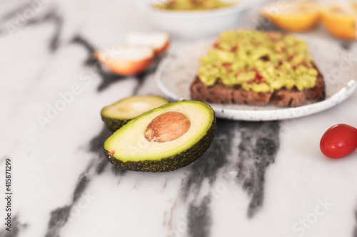 Avocado, tomatoes, lemon, onions, guacamole on bread. Ingredients on a marble table