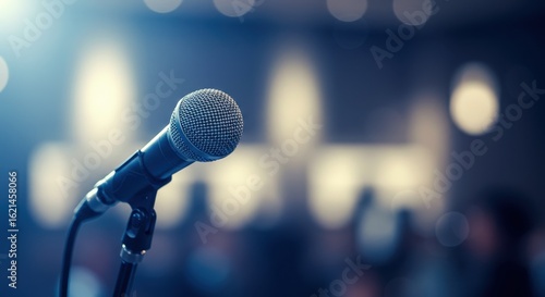 Awaiting the Voice: Microphone in Sharp Focus on a Blue-Lit Stage