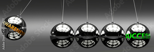 Awareness and success - the idea that Awareness helps to achieve success and happiness in business, work and life symbolized by English word Awareness and a newton cradle, 3d illustration