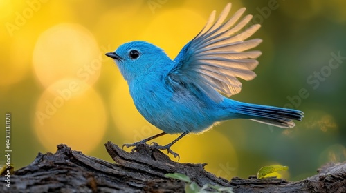 Azure bird poised on branch with wings spread against bokeh backdrop