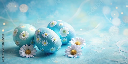 Azure Eggs Adorned with Delicate White Flowers on a Soft Blue Background
