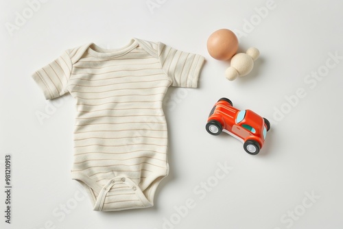 Baby boy beige onesie on light background. Fashion newborn clothes. Flat lay top view. Baby kids soft clothing set, wood toy. Infant trendy bodysuit made of organic eco friendly cotton. Gender neutral