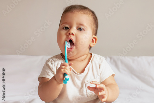 Baby girl Brushing Teeth on bed, light background, close-up, portrait