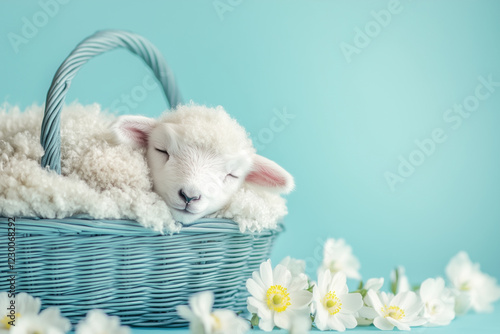 baby lamb resting in a sky-blue wicker basket with white anemones